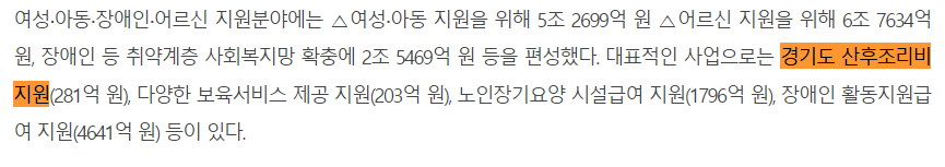 그 중 우리가 관심있는 경기도 산후조리비 지원에는 281억원이 편성되어 있는데요. 2021년도에는 경기도 출생 영아 99.9%가 경기도 및 각 시군으로부터 산후조리비를 지원받은 것으로 나타났습니다.